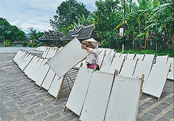 在耿馬孟定,芒團(tuán)傣家人以傳統(tǒng)技法制作生產(chǎn)的“白棉紙”早已遠(yuǎn)近聞名,每當(dāng)閑暇之時(shí),勤勞的傣家婦女便操持起造紙的活計(jì),因?yàn)樵旒埣妓嚇O其考驗(yàn)?zāi)托摹⒓?xì)致和精準(zhǔn),還有傳女不傳男一說(shuō)。男人們偶爾出些力氣活,幫忙采料和搗漿。走在村子里,家家戶(hù)戶(hù)的院落里都曬有白棉紙,大大小小的每一張都是一件藝術(shù)品。