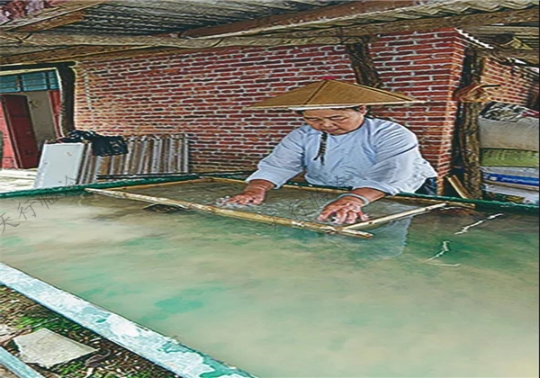 十一道工序分別為,采料:每年 7、8 月份,用采料刀剝下構(gòu)樹(shù)的皮,然后將樹(shù)皮的綠色表層清理干凈。曬料:將采下的構(gòu)樹(shù)皮掛在院子中讓太陽(yáng)暴曬。浸泡:把干樹(shù)皮放于小溪中,或者放在水池中,用涼水使之完全泡軟,去除構(gòu)皮料中的果膠成分,這一過(guò)程約需一晝夜的時(shí)間。較水池漚制發(fā)酵 , 芒團(tuán)便利的溪流不僅能快速達(dá)到脫膠之目的,且省卻一些工序設(shè)施。拌灰:用篩子將灶灰過(guò)濾之后(去火炭及其他雜物)均勻地灑在構(gòu)皮上。蒸煮:將拌灰后的構(gòu)皮放于鐵鍋中,蓋上麻布,連續(xù)蒸煮七八小時(shí)后?;?, 取出皮料再拌一次草木灰 , 爾后再蒸煮約4小時(shí) , 直至皮料煮成絮狀為止,這道工序約需一個(gè)對(duì)時(shí),即12個(gè)小時(shí)。蒸煮時(shí)所用的柴薪黑桃木在村旁有專(zhuān)門(mén)種植 , 村民均有成片屬于他們自己的林木 , 也像構(gòu)樹(shù)一樣幾年一砍 , 循環(huán)生長(zhǎng)很快。洗滌:將煮透的構(gòu)皮放到小溪或者水池中,用手把構(gòu)皮上的雜質(zhì)清洗干凈。搗漿:將清洗干凈之后的構(gòu)皮放在石墩上用木槌敲打出能在水中自然散開(kāi)的纖維為止。澆紙:將捶打好的紙漿撒在紙模中,再放入 7 分水滿的澆紙床中,用雙手?jǐn)囬_(kāi),使紙漿均勻的沉淀到白布上。待大體均勻后 , 再用手背順序拍打數(shù)次 , 使?jié){液下沉附著布面。然后用一細(xì)木棒上下左右在水中拍擊 , 使之均勻后將紙模提起 , 置于槽旁濾去水分,相繼制成三五張后,一并移至陽(yáng)光下曬干。曬紙:將紙模斜著豎起,讓水完全瀝干之后放到陽(yáng)光下曝曬,在將干未干時(shí) , 把紙模的一側(cè)先用手扯開(kāi)一縫以備揭紙。砑光:當(dāng)紙曬到七八成干的時(shí)候,用邊緣光滑完整的瓷碗輕輕打磨紙模邊角,讓紙變得更加光滑、更具色澤。揭紙:待紙完全曬干之后,用木刮在事先扯開(kāi)一縫處從上往下開(kāi)始操作 , 再用揭紙刀輕輕地揭下整張完整的紙,從而完成了整個(gè)造紙過(guò)程。