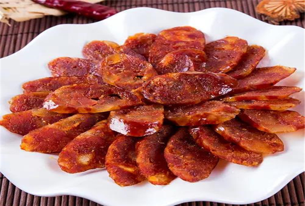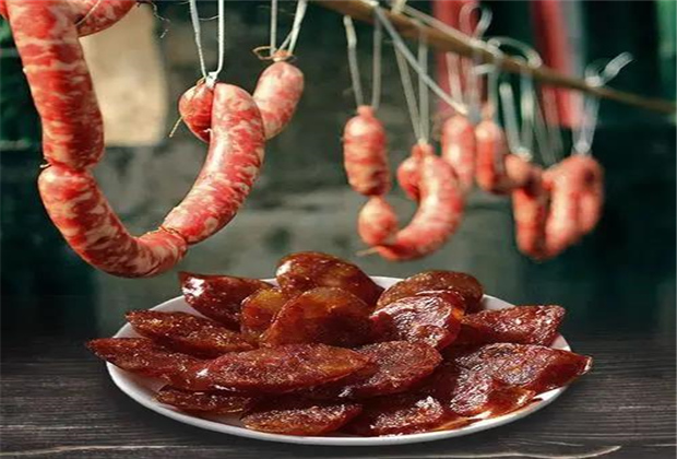 香腸得做“灌” ,先到市場上買小腸,然后回家用面粉、鹽反復(fù)漂洗,洗凈豬小腸后,還要挑選合適的肉和佐料,切碎,灌進(jìn)小腸內(nèi)。大部分人家挑選的是豬瘦肉,有添五花肉的,切成寸塊,根據(jù)各人喜好,拌進(jìn)不同的佐料;有加五香粉、八角粉的;有加糯米以增加黏度便于切片的;有滴酒添香的;也有僅加進(jìn)白糖和食鹽保鮮的。總之,各種不同配料的選擇,極大地豐富了香腸的品樣。春節(jié),隨意走進(jìn)鳳慶一戶人家,就會嘗到不同風(fēng)味的香腸,這些農(nóng)家手工腌制的不同風(fēng)味的香腸,是任何現(xiàn)代化的流水線所生產(chǎn)的香腸望塵莫及的。香腸灌好,用細(xì)線繩扎成一節(jié)節(jié)一拃多長的短節(jié),掛在房前屋檐下晾曬。這成了鳳慶鄉(xiāng)下臘月的一道風(fēng)景。