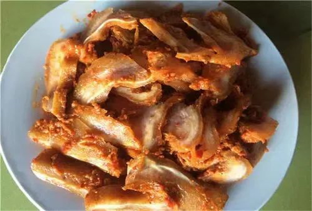 永德酸面肉是永德人喜愛的一道美食,酸中帶香,辣中有味。制作酸面肉一般是在冬臘月。原料以豬頭肉、豬腳手、五花肉為主,將豬頭肉剔骨,用炭火將皮燒焦,洗凈,然后加鹽、草果、花椒、八角等,將豬肉煮至八九分熟即可。然后加酸面,酸面要用炒熟的苞谷面和蘿卜絲,將豬頭肉、酸面、鹽、辣椒、花椒放入盆中攪拌均勻,就可放入陶罐中腌制了。腌制酸面肉的土壇子用稻草燒煙熏壇2~3分鐘,再加蓋密封,置于陰涼干燥處,腌制兩個月后即可開壇食用。制作酸面,最講究鹽巴的用量,太咸則苦、少則過酸。