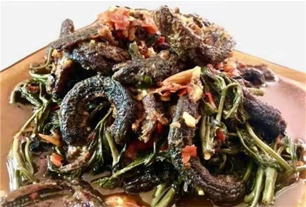 酸扒菜是鎮(zhèn)康人的招牌菜之一,正宗酸扒菜的原料十分講究,酸筍是不可缺少的一部分,還有青菜、洋芋、南瓜尖等,其它輔助配料有鹽、辣椒、花椒油等。將全部原料洗凈加入清水,放入鍋中大火燒開后用小火進(jìn)行慢燉1.5-2小時,待到菜完全煮熟煮“扒”后,放入酸筍及其他輔料,一鍋酸扒菜就做好了。酸扒菜的做法多種多樣,可做肉類,也可肉菜混合,做好的酸扒菜嘗起來不僅很開胃,而且又香又辣又酸,非常爽口。