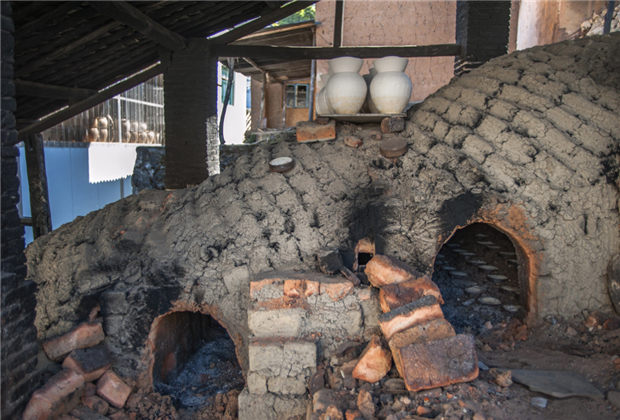 龍窯的龍頭到龍尾一倉比一倉大,共十六個倉,一般由八家人共用。每次燒窯,裝頭窯第一倉的人負責預熱?!搜b窯,燒窯也是做土陶最辛苦的工序,因此第一倉由大家輪流使用。裝頭窯的人要當天凌晨四五點起床,往頭窯燒火添柴,經(jīng)過六小時的預熱,整條龍窯都達到一定溫度,各家開始在自己的倉門處堆柴燒制。整個龍窯的土陶燒制完成,需要一天一夜。龍窯在一次次的柴火歷練中會受到損耗,每年村民都會湊錢修復龍窯和窯房,且每五六年就要把龍窯全部拆除,重新砌一條龍窯。