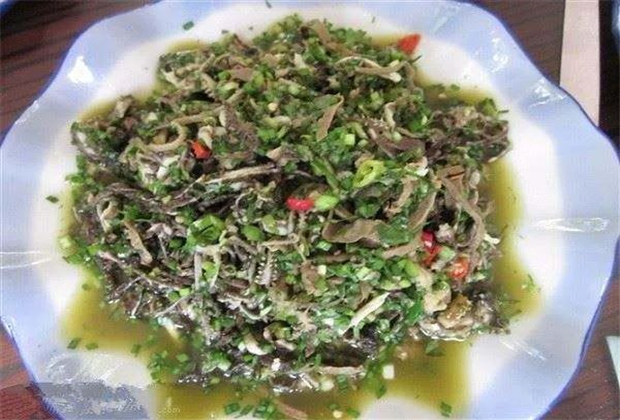 傣家有名的烤菜有雞、牛肉、豬肉、鯉魚和鱔魚,全用一種清香宜人的山茅草包裹,內(nèi)加各種香料蔬菜烤熟,味鮮,肉嫩,易嚼,營(yíng)養(yǎng)成分基本上保留下來(lái),炸菜最奇最怪的要算青苔片、苦涼菜、酸芭蕉片、牛皮膠條。青苔片用冷油炸制,顏色碧綠,味道清冽微寒。酸芭蕉生吃無(wú)法進(jìn)口,又澀又硬,經(jīng)油一炸,松軟柔和,酸甜相宜。牛皮膠用黃牛皮熬制而成,炸前顏色是半透明的琉璃色,炸好后瑩白油亮,脆泡香酥,拈一條蘸上番茄青椒芫荽醬送入口中,香而不臊、脆中有軟,酸辣香甜咸五味俱全。煎的也奇。青椒包肉,將肉包藏在肥碩的青辣椒肚里,美感十足,一下就能博得人們的青睞。炒的有臭蒸雞蛋,名臭實(shí)香,香中微有苦涼氣,令人回味。煮的有酸筍雞,傣家四周翠竹青青,傣家人將嫩竹筍漚酸后用來(lái)煮雞,耿馬的雞多是烏雞,體瘦長(zhǎng),絕少肥胖,肉又香又醇,配上酸筍一煮,色香味俱全。