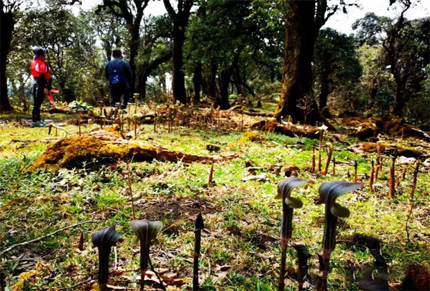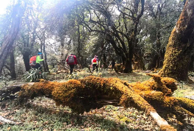 當(dāng)植被逐漸矮小、走上山頭,你會發(fā)現(xiàn)眼前豁然開朗,一片竹海躍然眼前。如果是春天,對面的山坡上大片的杜鵑花林,此時的海拔已經(jīng)接近3000米。沿著竹海中的小徑,我們標(biāo)識了最近最安全海拔為3080山頭,雖然沒有到達(dá)3098最高點,但是這里是所有人都可以完成的終點。