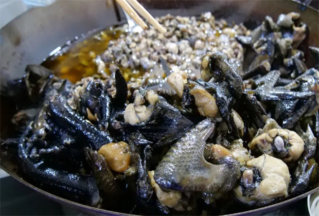 其實,云南也有自己的烏雞。云南烏雞產(chǎn)于瀾滄江中游無量山一帶的云縣、南澗、景東等幾個縣。云縣烏雞在云南較有代表性。2013年春節(jié)期間,臨滄市餐飲協(xié)會就在云縣舉辦了首屆烏雞烹飪大賽。云縣烏雞為本地原生雪山大種雞雞種,體型較大,成年雞體重在3千克以上,與江西泰和所產(chǎn)烏雞分屬不同品種。云縣烏雞,本地亦叫“烏骨雞”“黑肉雞”,其特征為喙、跖、舌均為黑色,殺開,雞皮、筋膜、肉骨均為黑色。云縣烏雞以“白毛、黑肉、綠耳”為上品。