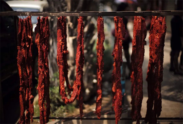 云縣回族群眾素有飼養(yǎng)菜牛腌制清真牛干巴的傳統(tǒng)手工藝。牛干巴味道鮮美可口,易保存攜帶,食用方便,因而頗受廣大消費者的青睞。回族要腌制色佳味美的牛干巴,必先喂養(yǎng)壯牛。宰牛,按照傳統(tǒng)習慣都由阿訇下刀,將割下的肉鋪在通風處涼透,之后再進行腌制,至肉面干硬,呈板栗色。煎干巴片香醇酥脆,油而不膩,實為酒席上的佳肴。