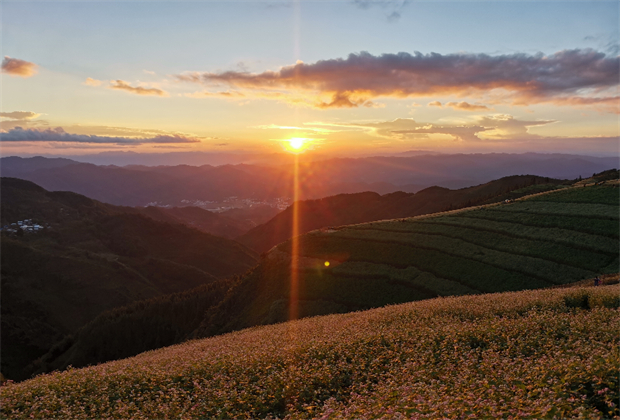 夕陽(yáng)時(shí)分,云上花海的顏色更豐富了。金色的光暈仿佛給勐佑的山峰披上了一層金色的薄紗,天邊的紅是少女害羞的臉龐。