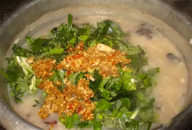 酸筍:即酸竹筍,將苦筍切成絲腌制而成,酸爽可口。將牛肉干放在配有各種佐料的酸筍湯中熬煮,加上精選大米,就成了美味飄香的干巴酸筍爛飯。除了要精選牛肉干和酸筍之外,配料也十分講究。將大蒜瓣、小米辣、花椒、鹽、味精等放入舂臼一起搗碎,放在一旁備用;再把阿佤芫荽、大蒜葉洗凈切碎備用。由于牛肉干本身就已經(jīng)有鹽,所以在準(zhǔn)備調(diào)料的時(shí)候,鹽只用少許即可。