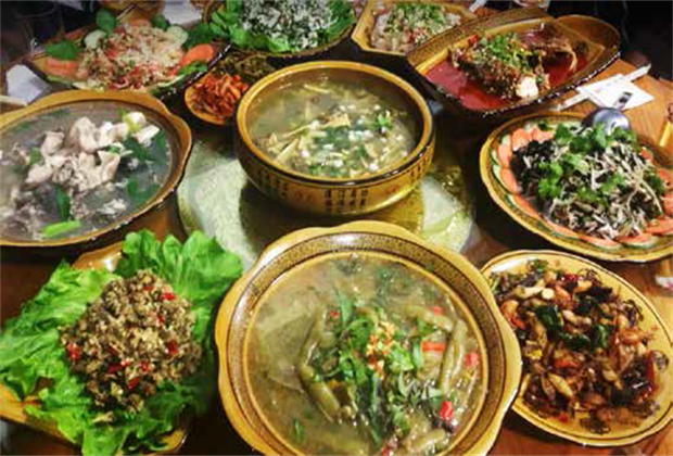 土司宴的食事和食單,都非常精致和奢華。全宴共分八葷八素。八葷為鷹窩山放養(yǎng)的烏骨雞做成的土鍋雞,紙山箐捕的白鷴與幫東大雪山采的黨參燉成的山珍湯,金竹林放養(yǎng)兩年的黑毛豬做成的酥肉、泡皮、姜絲排骨、旺子腌菜,涌寶拿魚河的細鱗魚做成的油淋魚,大朝山馬鹿塘腌制的麂子肉做成的火燒干巴。八素為后箐波羅的硬米做成的米粉干,官房的緬瓜(南瓜)做成的素蒸金瓜,西山寺的蕨菜做成的龍爪炒豆豉,茶房寺的綠豆做成的酥豆腐,東山寺的甜竹筍做的火燒鹽筍、苦竹筍腌制成的酸筍,另有鴿子蛋燉香菌和水煮黑雞樅。據(jù)傳,做土司宴的廚師,用的是牌坊街的龍井水,燒的是蠻賴山的麻栗柴。宴席用的是椿樹鼓凳八仙桌,青花瓷碗象牙筷。除了八葷八素,還有染飯花煮的黃糯米飯,勐稿(今涌寶)甜蕎面做的羊角扭和儲存多年的苦蕎酒。