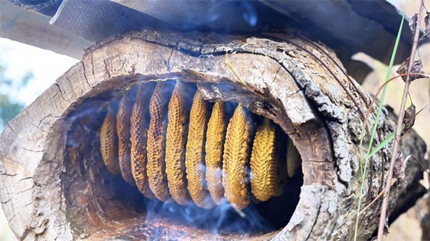 蜂蜜產(chǎn)量大增,進(jìn)入銷售旺季。養(yǎng)殖戶李秀才小心取蜜、打掃蜂箱,他看著色澤晶瑩的蜂蜜和新蜂王,臉上洋溢著豐