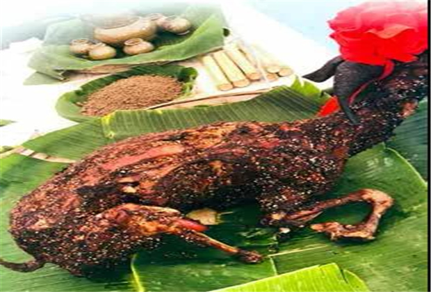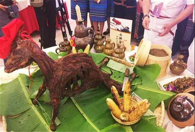 彝族俐侎人烤全羊是目前肉制品飲食中最健康環(huán)保的美食,烤全羊外表金黃油亮,外部肉焦黃酥脆,內(nèi)部肉綿軟鮮嫩,羊肉味清香撲鼻,頗為適口,別具一格,簡直就是俐侎人的“滿漢全席”。永德俐侎人烤全羊制作技藝現(xiàn)已成為臨滄市飲食類非物質(zhì)文化遺產(chǎn)項目。