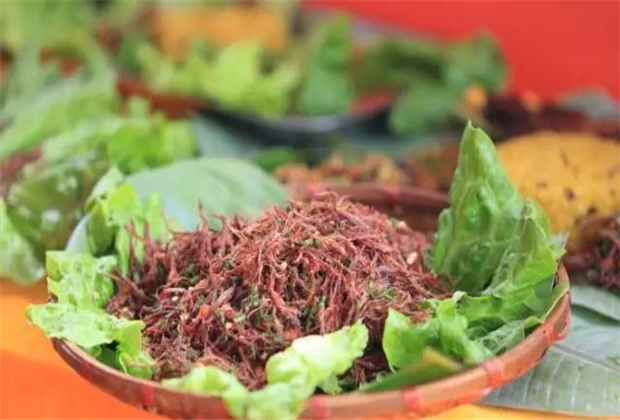 牛撒撇是傣家用來宴請賓客的世傳名菜,獨特的烹制方法讓牛撒撇細膩可口、香味醇正,色澤誘人,具有健脾、消燥熱的功能。曼聽園里的牛撒撇深受臨滄人民的喜愛,無論是朋友聚餐還是辦酒席,總能在餐桌上看到牛撒撇的身影。
