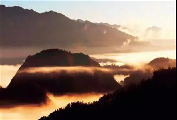 日出前,它像一位身姿婀娜的少女躺在山下,紋絲不動,靜如一汪清澈的湖水。早晨太陽冉冉升起,它開始慢慢起伏涌動,像少女舒緩地伸展手臂,任輕風舞弄著長裙。太陽出來后,云海變得絢麗多姿。開闊的地方,如激浪翻滾的波濤,狹窄的隘口,若飄逸晃動的白練。一些峰尖刺破云層,突兀矗立于蒼穹,像春筍出土,一個個小山帽游離于云海半截的山腰,像小舢板,蕩漾于云海波濤之中。時近中午,氣溫升高,這時云層開始急劇地翻滾、奔涌、群山、云海時隱時現(xiàn),極目之處,氣象萬千。