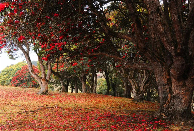 這里最令人嘆絕的是開遍漫山的萬畝連片杜鵑林。杜鵑林隨著山形和樹枝高低大小錯落,聚散有致,似一團(tuán)團(tuán)彩云隨心翻滾,無意堆砌,構(gòu)成起伏跌宕、前呼后擁的花潮,似連綿不斷的山峰,又似波濤奔騰的海洋,真是天工開物,非人力所能。每年2月中旬到5月中下旬山花爛漫之時,置身于花海中,沁人心脾,樹上開滿鮮花,下面落花鋪滿地,人走上去松松軟軟的,如踩在很厚的鮮花地毯上,“踏花坡”也因此而得名,并成為一大旅游亮點。