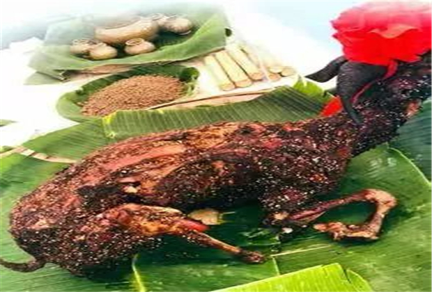 俐侎人烤全羊歷史悠久,之所以如此馳名,除了它選料考究外,就是它別具特色的做法:選擇羯羊或周歲以內(nèi)的肥羊羔作為主要原料,屠宰后割去羊頭,以細(xì)鐵條在羊腳毛皮下鉆洞吹氣,邊吹邊拍打,讓氣流貫滿全身,直到羊皮層膨脹,再澆沸水刮毛。刮洗干凈后,剖除其腸肚,再將羊尾用鐵簽別入腹內(nèi),胸部朝上,四肢用鐵鉤掛住皮面,羊腹內(nèi)放入調(diào)料,先用鹽、花椒、辣椒等佐料抹于羊體內(nèi)外,再以鋼釬縱貫羊體,置于炭火之上,翻轉(zhuǎn)烘烤。烘烤時還得不斷地抹上秘制的調(diào)料,約4~5小時后,羊皮黃肉熟,香味撲鼻,即大功告成??臼斓娜蛏珴晒饬?,皮脆嫩,味道極為鮮美,真可謂色、香、味俱全。宴席上俐侎頭人從羊頭、羊身、羊尾各品嘗一小塊后,其余人等方可動筷。吃時以刀分割成2~3指寬窄的小塊小條,置于盤中,佐以椒鹽等調(diào)料。