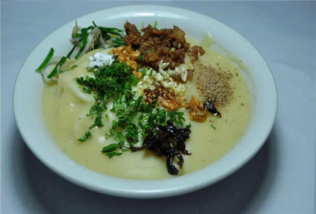 稀豆粉吃法十分豐富,云南各地的吃法也完全不同,充分體現(xiàn)了不同地區(qū)不同的飲食文化特色。地道的老昆明鐘愛稀豆粉配油條這種吃法,先將做稀豆粉的調(diào)料調(diào)配均勻,將炸得酥脆可口的油條用剪刀剪成長約10厘米左右的條,吃時用油條蘸著稀豆粉吃,油條的香脆與稀豆粉的香滑讓人難以割舍。在騰沖等地,稀豆粉餌絲也是頗受歡迎的食物,將騰沖特制的餌絲煮好后,將稀豆粉勺于其上,再加上各種調(diào)料拌食,雪白如絲的餌絲與黃艷細(xì)滑的稀豆粉相映成趣。會澤等地喜歡將稀豆粉飯食之道搭配蕎絲、洋芋粑粑等吃。臨滄人則喜歡將稀豆粉配攏米線來吃,將燙過的米線入碗,舀一勺稀豆粉淋在米線上,澆上醬油、鹽、姜末、蒜汁、油辣椒、花椒油、芝麻、青蒜葉,一碗稀豆粉米線就做好了。攪拌而食,色澤金黃,滑而易吸,味香爽口,成了臨滄人生活中一道不可或缺的風(fēng)味小吃。