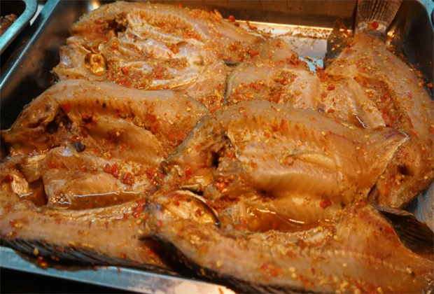 煳辣魚。做煳辣魚的原料首選鯽魚。以每條兩三兩重為最佳,把魚拾掇干凈,加鹽稍作腌漬,下鍋,七八成熟時加干辣椒段炸炒,出味后再放生姜,起鍋時加胡椒粉,如此胡椒和辣椒的味道便慢慢滲入魚肉,食之鮮、香、辣諸味混合,妙不可言。魚吃完,就湯煮上各種時鮮小菜。煳辣魚的精髓全在這“胡辣”二字,胡椒粉和干辣椒的量一定得放足。
