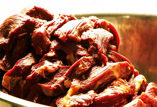 云縣回族群眾素有飼養(yǎng)菜牛腌制清真牛干巴的傳統(tǒng)手工藝。牛干巴味道鮮美可口,易保存攜帶,食用方便,因而頗受廣大消費者的青睞。回族要腌制色佳味美的牛干巴,必先喂養(yǎng)壯牛。宰牛,按照傳統(tǒng)習慣都由阿訇下刀,將割下的肉鋪在通風處涼透,之后再進行腌制,至肉面干硬,呈板栗色。煎干巴片香醇酥脆,油而不膩,實為酒席上的佳肴。