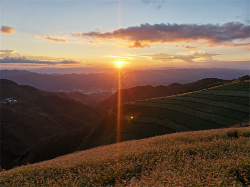 夕陽時(shí)分,云上花海的顏色更豐富了。金色的光暈仿佛給勐佑的山峰披上了一層金色的薄紗,天邊的紅是少女害羞的臉龐。