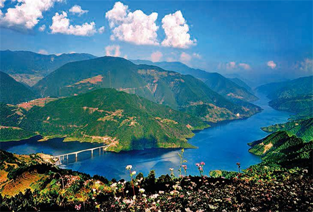 漫灣百里長湖青山l簇簇綿延,湖水碧藍浩淼,山水相映,水天一色,站立船頭,便可領略“五百里滇池奔來眼底,又見三百里平湖出于高峽”的大美風光。蕩舟湖中,舟移景換,頗有“分明看見青山頂,船在青山頂上行”的感覺。湖邊連片的良田、花草、樹木和悠然自得的牛羊,以及掩隱在萬綠叢中的少數(shù)民族村落,在藍天碧水的映襯下,顯得秀麗高雅,譜成一首如詩如畫、如夢如幻的田園生活樂章,形成一種天、水、人和諧共處,人與自然親密無間的極樂景象。