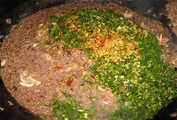 等到米要熟透時(shí),把雞拿出來(lái),用手撕下肉,把雞血同蔥、茴香、蒜、香辣蓼、薄荷、阿佤芫荽等佐料一起拌勻,放進(jìn)鍋中,蓋好鍋蓋后端下來(lái),燜少許時(shí)間。