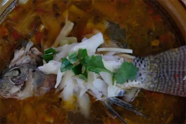 先將酸筍在鐵鍋上翻炒待水氣蒸發(fā)后放入適量豬油炒出香味,喜歡辣口的可提前加入小米辣和酸筍一起炒,加入適量的高湯,鹽巴調(diào)味。沸騰后再放入洗凈切成塊狀的魚肉,加入切好的姜絲去腥,出鍋前放上蔥段、香菜、阿佤芫荽等佐料煮熟即可食用。這道菜酸香可口,十分開胃。一碗米飯舀上一勺湯,來上一口,真的是人間值得啊!