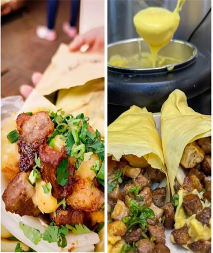 鳳慶粑粑卷是鳳慶縣的一大特色美食,是鳳慶廚師應(yīng)市的佳作,是集云南民間吃豌豆、稻米的食風(fēng),分制合成而食的又一名點(diǎn)。粑粑卷的主要配料有大米粑粑、鍋巴、稀豆粉和各種調(diào)料,鍋巴和稀豆粉是“靈魂”,并且都是由豌豆粉做成。將豌豆粉加水稀釋,隨后加鹽、辣椒面等進(jìn)行調(diào)味,用勺子在燒熱的鐵鍋中均勻涂抹調(diào)好的豌豆粉,幾十秒內(nèi),一張香脆可口的粑粑卷外皮就做好了。此時(shí),將大米粑粑烤熟,加入蒜末油等調(diào)味料,一卷美味的粑粑卷就做好了。輕咬一口,口感軟糯脆香。粑粑卷是當(dāng)?shù)厝俗钕矏鄣囊环N特色小吃,也蘊(yùn)含著當(dāng)?shù)厝说娘嬍沉?xí)慣。生活在他鄉(xiāng)的游子們,一回到鳳慶,常常要先吃幾個(gè)粑粑卷解解饞。