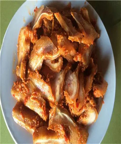 永德酸面肉是永德人喜愛的一道美食,酸中帶香,辣中有味。制作酸面肉一般是在冬臘月。原料以豬頭肉、豬腳手、五花肉為主,將豬頭肉剔骨,用炭火將皮燒焦,洗凈,然后加鹽、草果、花椒、八角等,將豬肉煮至八九分熟即可。然后加酸面,酸面要用炒熟的苞谷面和蘿卜絲,將豬頭肉、酸面、鹽、辣椒、花椒放入盆中攪拌均勻,就可放入陶罐中腌制了。腌制酸面肉的土壇子用稻草燒煙熏壇2~3分鐘,再加蓋密封,置于陰涼干燥處,腌制兩個(gè)月后即可開壇食用。制作酸面,最講究鹽巴的用量,太咸則苦、少則過酸。