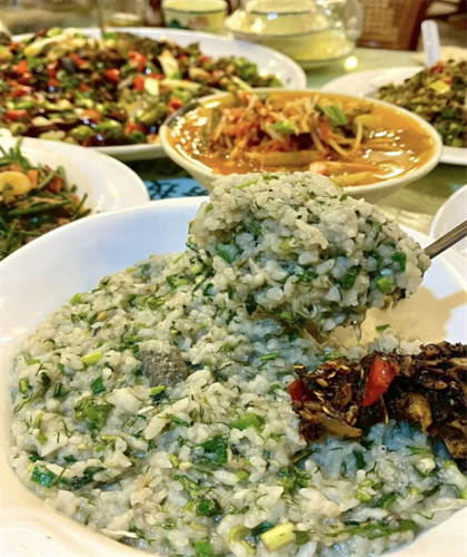 佤族雞肉爛飯,佤語叫noig ia“饃牙”,是佤族飲食文化的代表之一,滄源佤王宴的主食之一,也是佤族迎賓待客的美味佳肴,2022年,佤族雞肉爛飯制作技藝被列入云南省第五批省級(jí)非物質(zhì)文化遺產(chǎn)代表性項(xiàng)目名錄。把清洗好的米倒進(jìn)雞湯煮至大米熟爛、稀稠,插筷而不倒。把晾涼的雞肉用手撕成絲與骨頭分開,將撕細(xì)的雞肉倒入鍋中同稀飯攪拌均勻,蓋上鍋蓋燜煮三分鐘左右。出鍋時(shí)加上切碎的阿佤芫荽、野生香蓼、青小米辣、嫩茴香葉、小蔥等佐料,美味的雞肉爛飯就烹制完成。雞肉爛飯口感細(xì)膩絲滑,伴隨著阿佤芫荽特有的香味,仿佛置身于臨滄的山林之中。