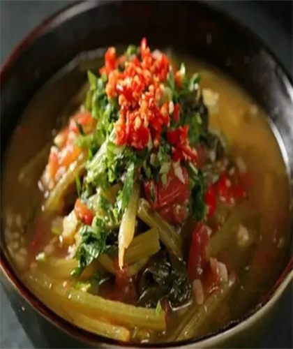 酸扒菜是云南鎮(zhèn)康地地道道的風(fēng)味菜,從縣城到農(nóng)村,鎮(zhèn)康人都有做酸扒菜的歷史,酸扒菜是鎮(zhèn)康人的拿手菜,是鎮(zhèn)康人的招牌菜之一。做一道酸扒菜并不難,但吃起來要酸香味俱全就很不容易。酸扒菜有個(gè)特點(diǎn),不同的人用同樣的食材做出的酸扒菜味道也有差別。衡量酸扒菜做得如何,關(guān)鍵是吃起來是否酸到胃、辣到胃、香到胃。在鎮(zhèn)康,有這樣一個(gè)故事,講的是一位遠(yuǎn)方的客人來到鎮(zhèn)康,好客的主人用鮮魚招待這位客人。當(dāng)主人拿酸筍子準(zhǔn)備放入鮮魚湯里,客人看見了說,哎呀!別放了,這東西與鮮魚放在一起一定不好吃,會(huì)破壞魚肉的味道。主人說,你以前沒吃過怎么就知道一定不好吃呢?放上嘗一嘗好嗎?吃飯了,客人嘗了嘗,覺得味道很好,并贊不絕口,魚肉也顧不上吃了。酸扒菜有兩個(gè)重點(diǎn),也就是在“酸”和“扒”兩個(gè)字里。煮酸扒菜一定要放酸的配料,除了酸筍還可以選擇酸木瓜、西紅柿、大樹番茄等。“扒”字意思是食物經(jīng)過烹煮后,已經(jīng)熟了,入口酥爛能吃了的意思,所以酸扒菜的“扒”字就代表著需要長時(shí)間地煮才能達(dá)到。只有經(jīng)過長時(shí)間的小火慢燉,食材味道才能充分實(shí)現(xiàn)美美與共的統(tǒng)一。