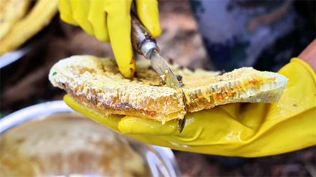 蜜。蜜蜂養(yǎng)殖戶李秀才將蜂箱安置在與芒果園相對(duì)望的山野之中,漫山遍野的芒果花為蜜蜂提供了豐富的蜜源。當(dāng)下,